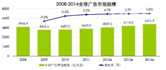 全球广告市场缓慢增长,平稳加速。艾瑞ZenithOptimedia实力传播媒体集团近日发布数据,显示在2009年全球广告市场出现较大下滑之后,自2010年市场开始逐渐恢复,2011年市场规模增长到4643.0亿美元,较2010年增长3.5%,未来将会呈现稳步增长态势。