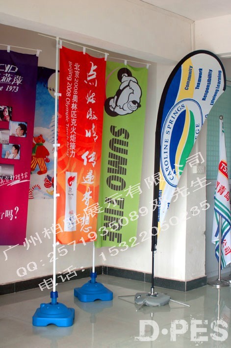 沙滩旗有:插于草地的沙滩旗使用钎子插入地下,而水泥地面则有注水旗座,十字支架底座等。